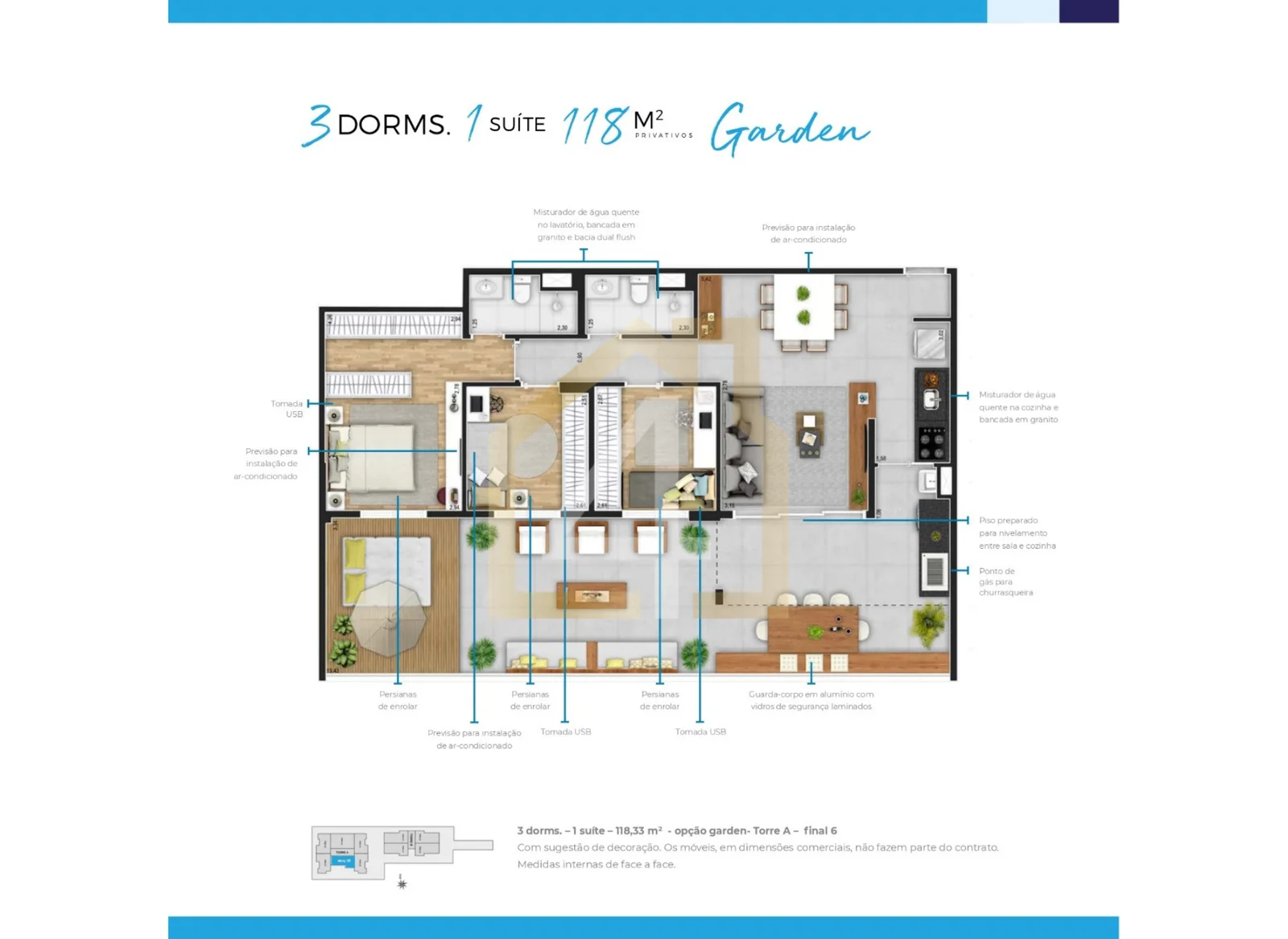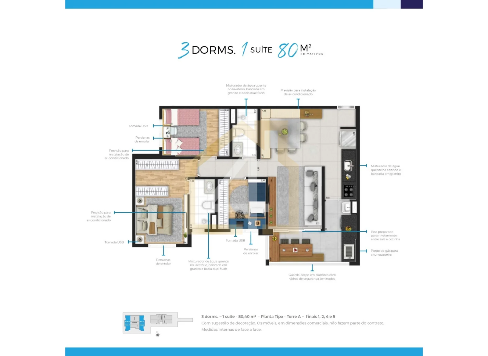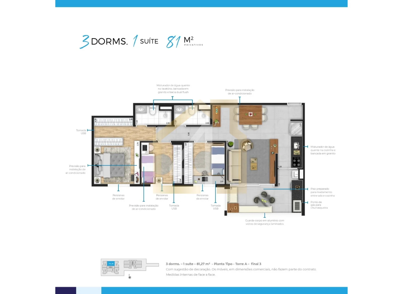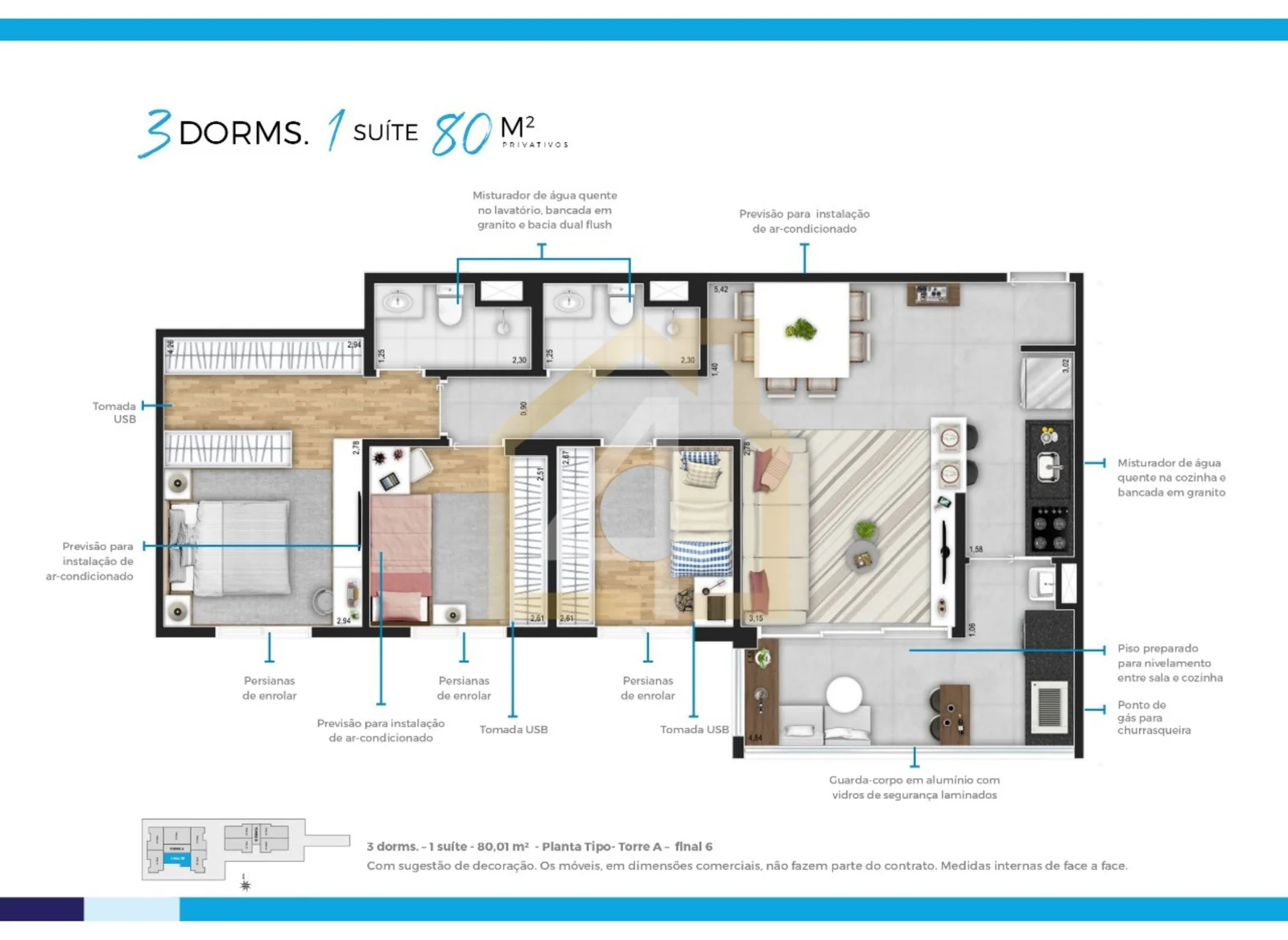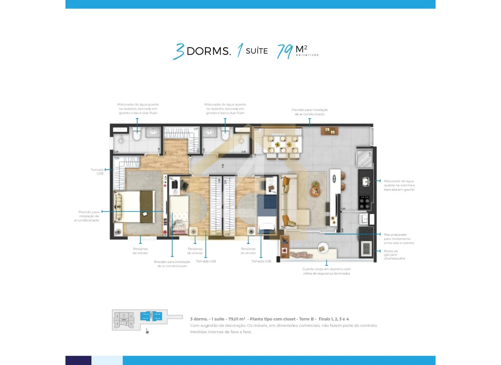 79 m2, 3 dorms, 1 suíte, 1 vaga
